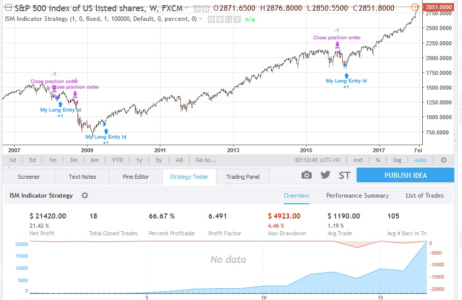 (abajo una estrategia simples de entrada quando ISM superior a 50 e salida quando abajo de 48.5 - pero se optimiza mujo quando el ISM sube relativamente al mes passado mysmo si continua negativo -Solo no funciono en 2002 pero la razon de no funcionar es macro...un dia de estos explico porque 2002 fue un ano que el ISM no funciono pero es devido a los gastos militares pos 11/9/2001 que debilito la industria Ex-militar)