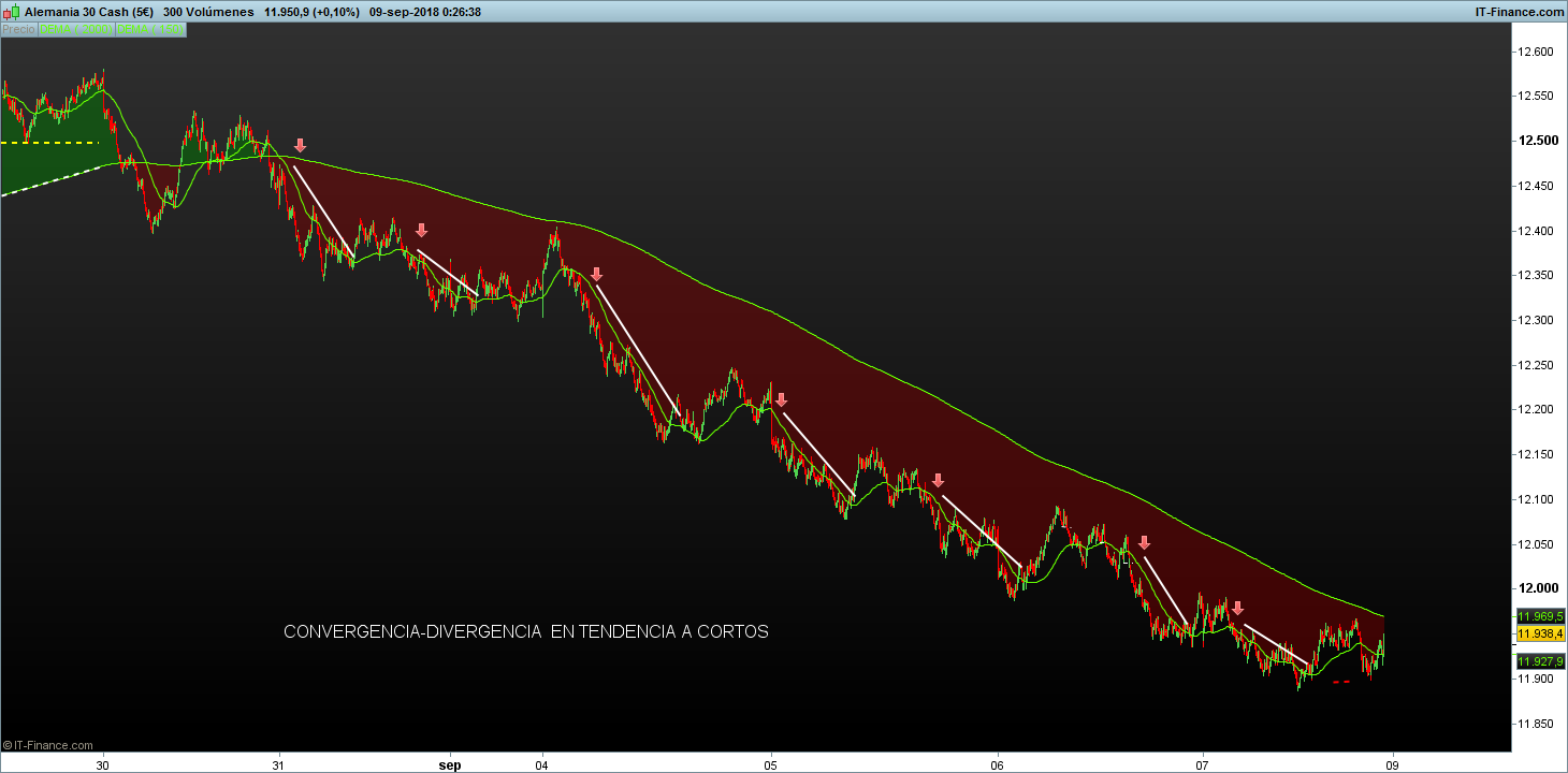 1º Un sistema con similar filosofía al utilizar la pendiente en este caso de dos medias, se utiliza la convergencia-divergencia entre ellas para cerrar-abrir posiciones y esta orientado al intradia del rango de sesión y también al swing, pero me limitare al intradia para simplificar