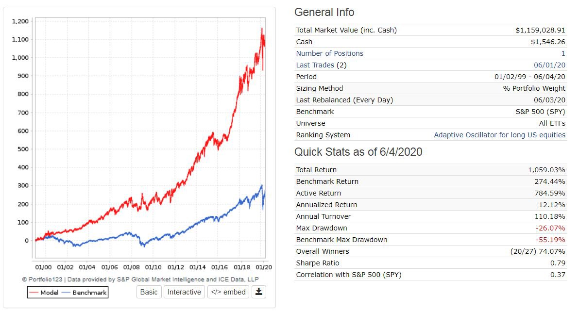 Puede parecer que se trata de un canteo o un órdago pero ayer le pedí a mi buen amigo Nacho Villalonga que hiciera un backtest rápido de la estrategia usando Portfolio123 y el resultado es el siguiente:Más que recomendar, quiero hacer una apuesta con los lectores de X-Trader.net, al estilo de Warren Buffet: me apuesto un café con todo aquel que quiera comprobarlo, a que va a ganar más a largo plazo con el siguiente sistema que con su método habitual. Las reglas del sistema que deben seguir son las siguientes: