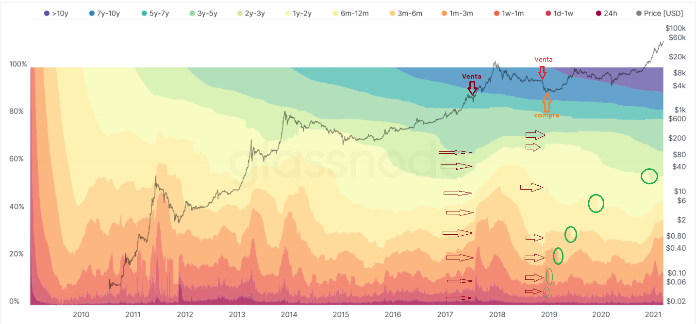 El caso de la compra fue justo después de la última venta, la propia compra desplazó un 30% el precio, aprovecharon los precios bajos de la última caída y hasta día de hoy pues compraron en el mismo mínimo y siguen con la posición abierta según esa gráfica. Compraron en la tercera semana de diciembre de 2018 entre 3000 y 4000 y actualmente ganan 15 veces lo invertido. Como se aprecia en los círculos verdes el impacto de la compra perdura en el tiempo pasando de una franja inferior a la superior con prácticamente el mismo impacto en el porcentaje total de bitcoins. Calculando a ojo la compra fue de unos 600000 bitcoins que valdrían ahora unos 32MM.