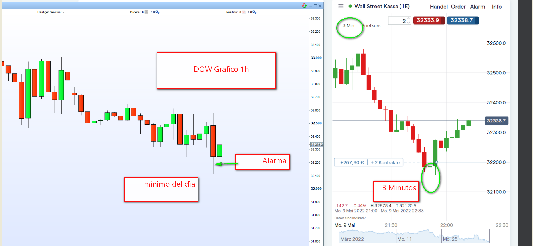 He puesto un Alarma y en el grafico de 3 Minutos al hacer el precio una revsersion he abierto una posicion con 2 CFDs.