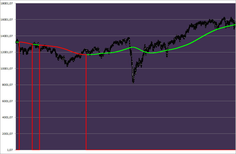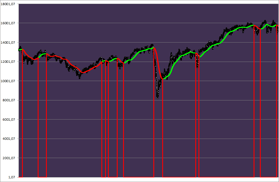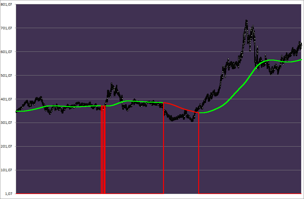 Cuando las medias de los dos timeframes estan alineadas abre operacion larga, es un metodo que se lleva utilizando hace mucho tiempo y por si mismo sin mas filtros tengo dudas de que tenga ventaja significativa porque las tendencias robustas tienen base fundamental, si obviamos esto nos quedaria una estrategia tecnica