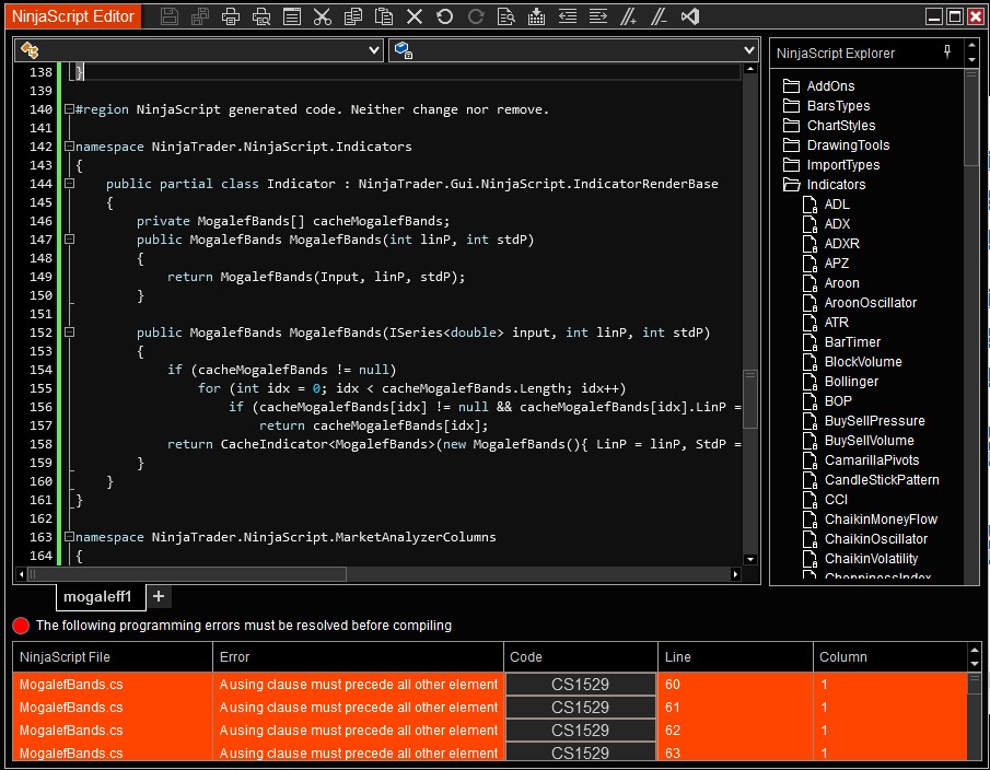 Recuerda primero crear un nuevo indicador en NinjaTrader8 con el nombre exacto: MogalefBands y le das directo a "generate", luego sólo copiar (el código que presento abajo), pegar en la ventana del nuevo indicador que has creado en NT8 (recuerda antes de seleccionar todo con un control+A), le das a la tecla F5 para compilar, et voilà...