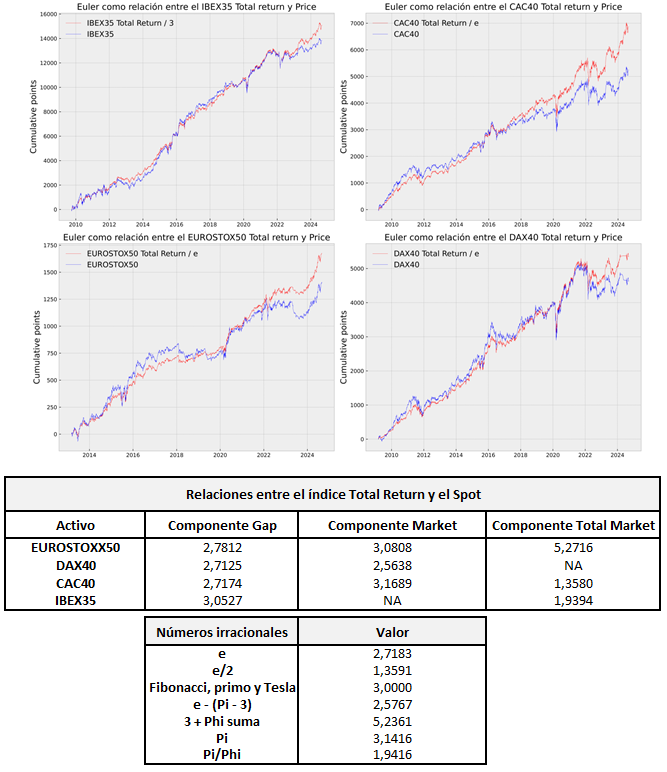Sabiendo esto, lo mas lógico seria pensar que la relación entre el componente Total Market del índice total return y del spot es el número de Euler. Sin embargo, en la tabla adjunta a este post, se demuestra que eso no es así, ya que si buscamos con la herramienta Solver, el valor que iguala ambos índices (o que minimiza la diferencia entre ambos), solo el gap de apertura presenta dicho número.