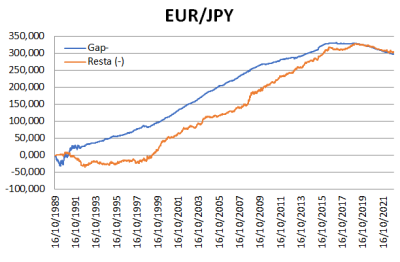 Un ejemplo de este indicador para una divisa como el USD/JPY (en las divisas y casi solo en ellas, el gap en negativo marca los máximos de mercado, en el resto de activos eso no es así):
