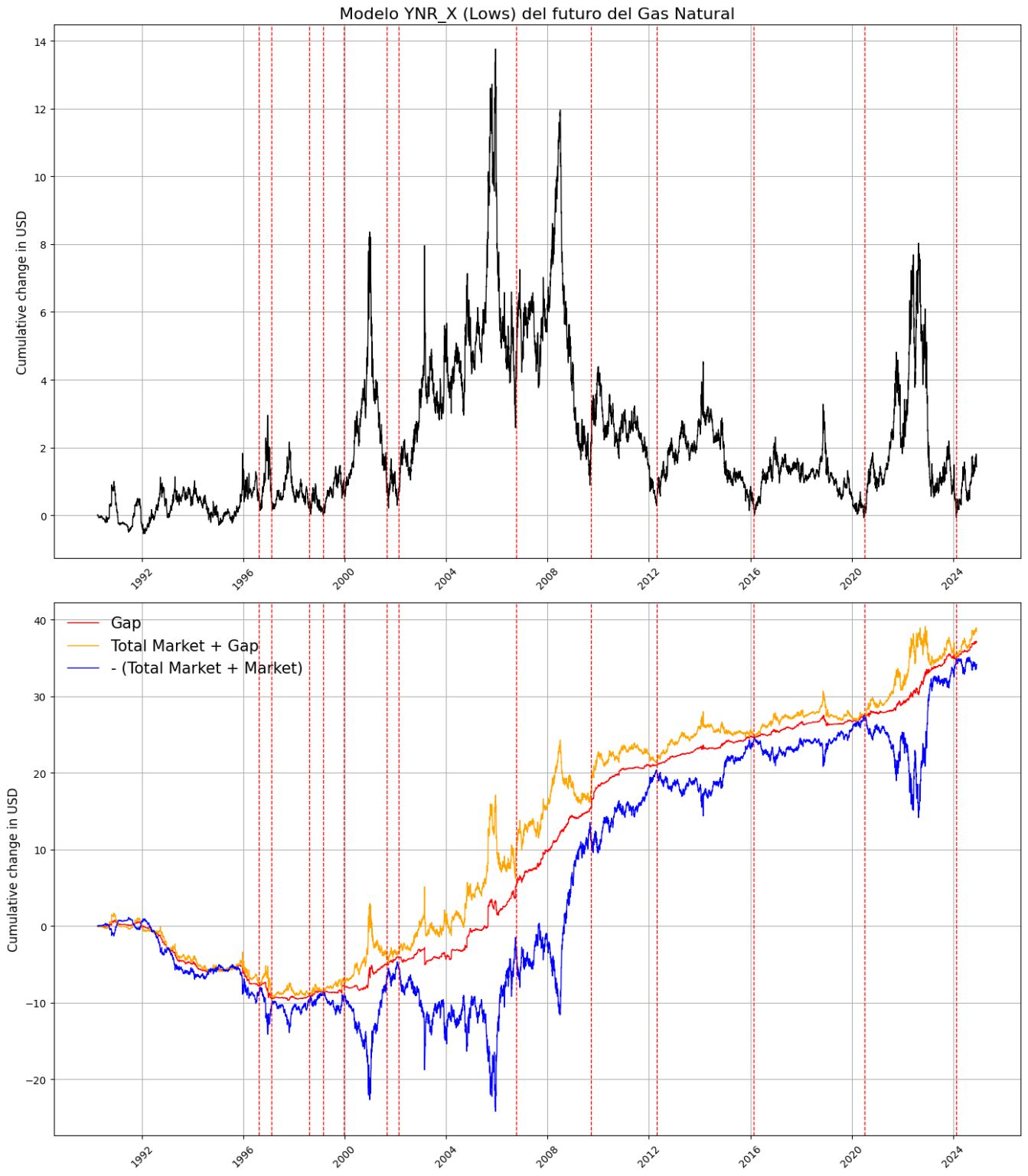 Comprobamos como para ese activo, se detectaban todos los grandes mínimos de mercado desde los años 90, tal cual se muestra a continuación: