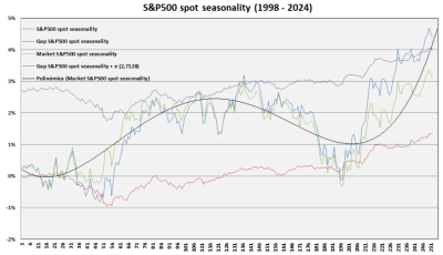 Hace ya 1 año, se publicó un artículo titulado "A new approach to understanding seasonality", y en cual y grosso modo, se demostraba como para múltiples activos, pero en especial para el caso del S&P500, el componente Gap estacionalizado, marcaba los valores mínimos del S&P500 estacionalizado, y al sumarle el número "e", nos marcaba los máximos.Link al artículo completo: https://bit.ly/3QMxIIZ