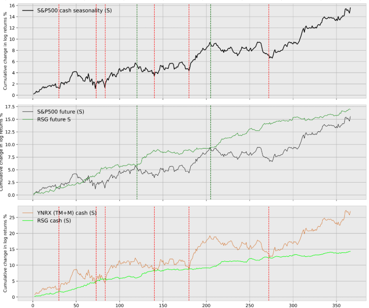 En anteriores post, se hizo un gran descubrimiento, es que si estacionalizamos no solo el mercado total, sino también el componente gap t market de un activo como lo era el SYP500, estos componentes y su interconexión con el merado, podían marcar los mínimo de la estacionalidad de este activo.