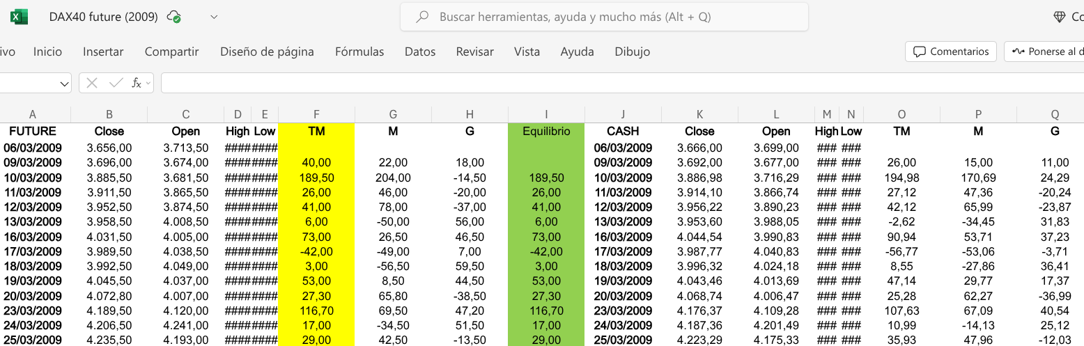 Estas fórmulas permiten equilibrara componentes GAp y Market entre el futuro y el contado de un activo concreto, y aplicándolas al caso del DAX40 cash y future, así se demuestra (columna amarilla y verde)