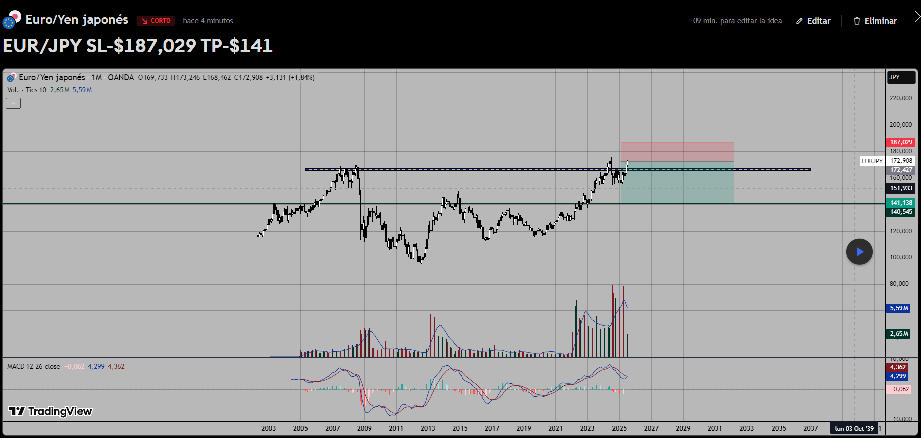 Resistencia importante que se mantiene en este par de divisas desde el año 1998. Es muy poco probable que no haya una fuerte reacción a la baja, y proyecto como objetivo más seguro los $141.