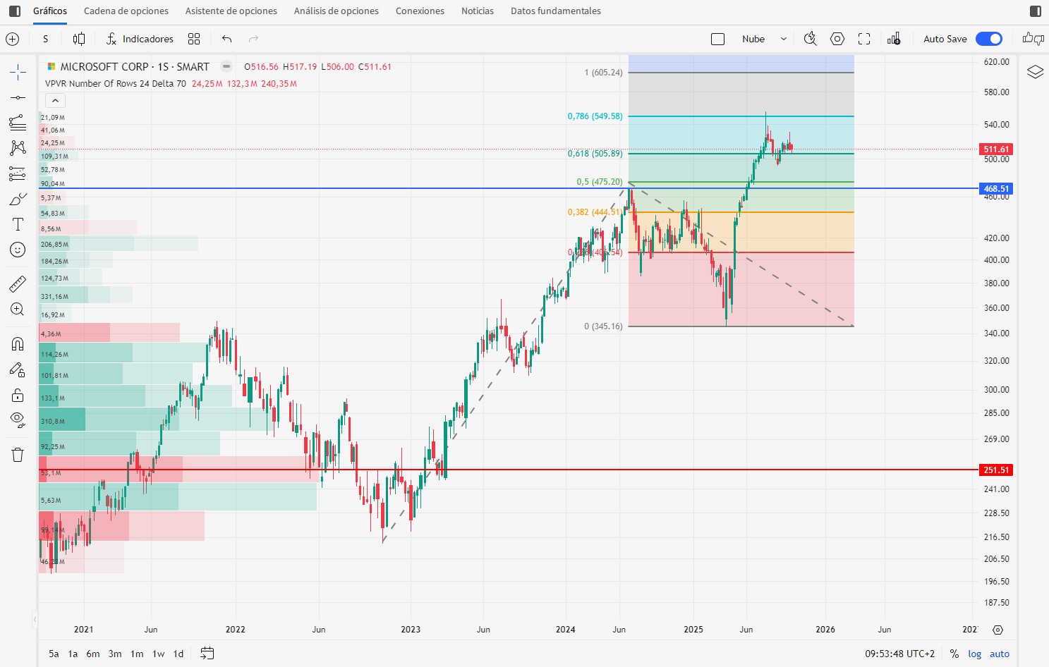 La herramienta que uso y quizá la más popular, cuando un activo rompe máximos y entra en subida libre, es la extensión de fibbo.
