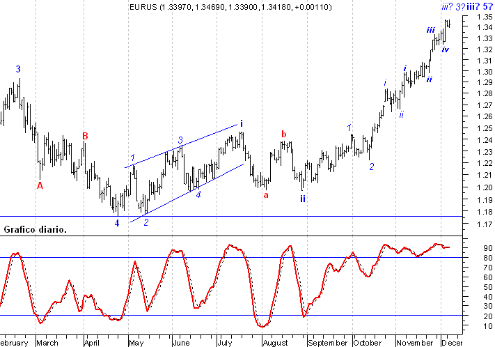 Si observamos el grafico diario podemos ver como la onda 5 podria encontrarse en un estado avanzado. Desde los minimos anuales del mes de abril parece haber desarrollado una onda i al alza en forma de cuña de inicio, una onda ii en forma de plana o zigzag y una onda iii que podria estar muy cerca de finalizar, no solo por el hecho de que exista un recuento de ondas internas que asi lo indicaria, sino por el hecho de estar en una importante zona, los 1.35, como podemos ver en el grafico mensual.