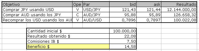 PD: para quien pueda estar interesado y brevemente, lo del triángulo de arbitraje consistiría en (siguiendo los cruces mencionados arriba como ejemplo) comprar JPY usando USD, a continuación comprar AUD usando los JPY y finalmente volver a comprar los USD usando los AUD. Si esto se hace en un momento en que la "eficiencia del mercado" está en proceso de "recolocarse", se puede obtener un beneficio de la ineficiencia transitoria y encima sin riesgo (teóricamente).