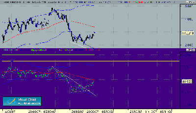 1º Toke a la directriz y forma divergencia ......100 pipos pabajo y al bajar forma cuña apoyandose en banda exterior baja bollinger en 45, el rsi corta su linea y el rebote esta servido, ahi piensa que stop necesitas........ muy poco, esas figuras de cuña ...........