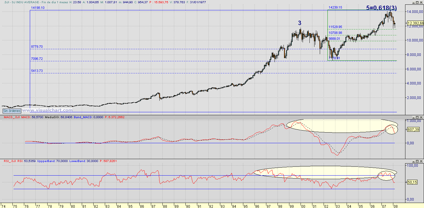 Lo que está claro es que lo único que hay realmente objetivo es el gráfico. Si quieres saber algo del mercado pregúntale al mercado, eh?, no?. Pues bien, el Dow anticipa objetivos de caída en cadena que le llevan a corregir más allá del 0,618 de la última onda alcista (la que empieza en 2003), lo cual a su vez anticipa que desgraciadamente no se quedará ahí la cosa porque está corrigiendo un impulso aún mayor. Es decir, la subida desde el 2003 no sería más que un Superciclo, la 5ª onda del Gran Superciclo que se está corrigiendo. Así, según esta cuenta, la onda 1 arrancaría en no sé donde de no sé que año (no tengo datos), la onda 3 del superciclo arranca en el año 1975, desde un Dow a 600 puntos, y la onda 5, esta última que hemos visto, en el 2003, desde un Dow a 7200 puntos (que es exáctamente el 0.618 de la 3ª onda lo que le da consistencia a la cuenta).