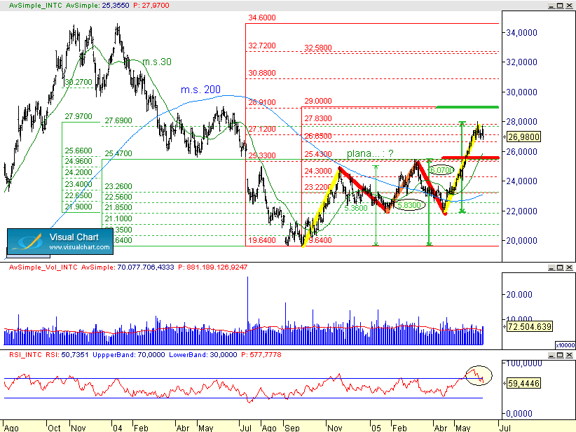 Se pueden seguir observando "coincidencias" tEcnicas en el grAfico pero para no aburrir sacaremos par de conclusiones, q al final es la ansiosa respuesta q todo el mundo espera, y no es otra la conclusi0n q la zona de compra entre 21.5 y 21$ q presenta INTEL, para, en caso de tratarse de el final de una correcci0n alcista en zig-zag de lo q habría sido un primer impulso alcista en A encontrarnos ante un siguiente movimiento alcista y por tanto cambio de tendencia mayor previa-recuerden q venimos de un triple techo en Noviembre 2003 en 34.56$ y Octubre 2000 en 74$, y por lo tanto la posici0n es LARGA (hasta el infinito y + allá), ó, en caso de tratarse de una correcci0n al bajista desde C y continuar con esa tendencia mayor desde los 34.56, la posici0n sería CORTA, pues, como bien pocas veces se ESPECIFICA, tenemos posiciones CORTAS en TIEMPO tambien - SHORT TERM, y posiciones CORTAS de VENTAS- SHORT SELL. Cuando se habla de posiciones CORTAS comprando, se refieren a posiciones compradoras de corta duraci0n (contra-tendencia), en este caso por ejemplo si se trata de una compra en 21 (pongamos por ejemplo), pues una posici0n corta en tiempo al tratarse de lo q estaríamos descontando como un rebote, se entiende q se mantiene (dejando correr los beneficios claro estA) hasta pongamos por ejemplo los 22.63 o akel precio q muestre gran resistencia o un % "corto". Weno, lo digo solo por la escasez de SHORT TERMS cuando la gente habla de "cortos", como si solo se trataran de ventas en descubierto.