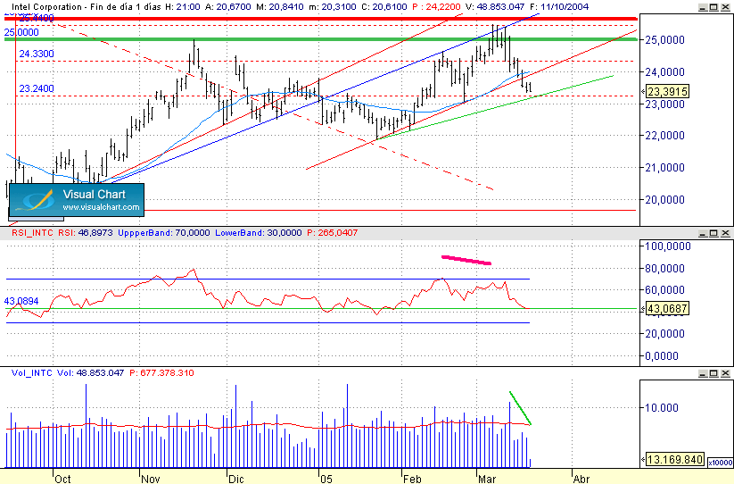 De cerca tenemos esa megadivergencia q se ha creado con el RSI y mantiene tanto la directriz alcista de este oscilador como la ULtima del precio q supone una extensi0n fibo de los 13$ de Octubre 2002 con lo q mientras no pase de esos 26$ q aparte de ser un soporte muy importante a lo largo de la historia bursAtil de la compañia supone la anterior resistencia en esta ultima escalada y el 0.4, pues permanece alcista a medio plazo, así q esos 26$ si o sí tienen q ser compra si esto sigue parriba, Y, si no ocurre así...p0s...algo nos estarA diciendo y desde luego los 23$ muchísimo mAs pues se tratan del 0.6 de Este ULtimo alcista del q hablamo y ad+ la directriz verdota de los 19$, así q los rangos estAn bien marcados tanto por arriba como por abajo.