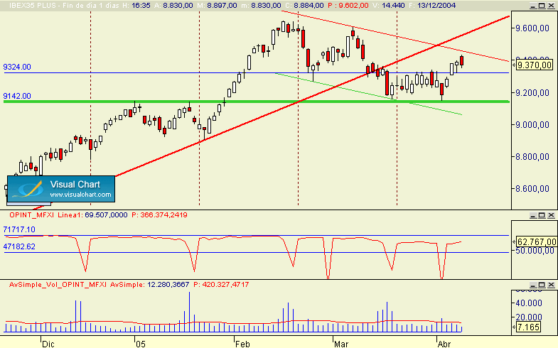Así q ia tenemos un precio importante de referencia, y no es otro q los 9325 para confirmar posiciones compradas con un rango de 50 puntos hasta los 9275. Perder ese precio supondría una welta al origen en 9150 y me imagino q n0 precisamente para pararse ahí.