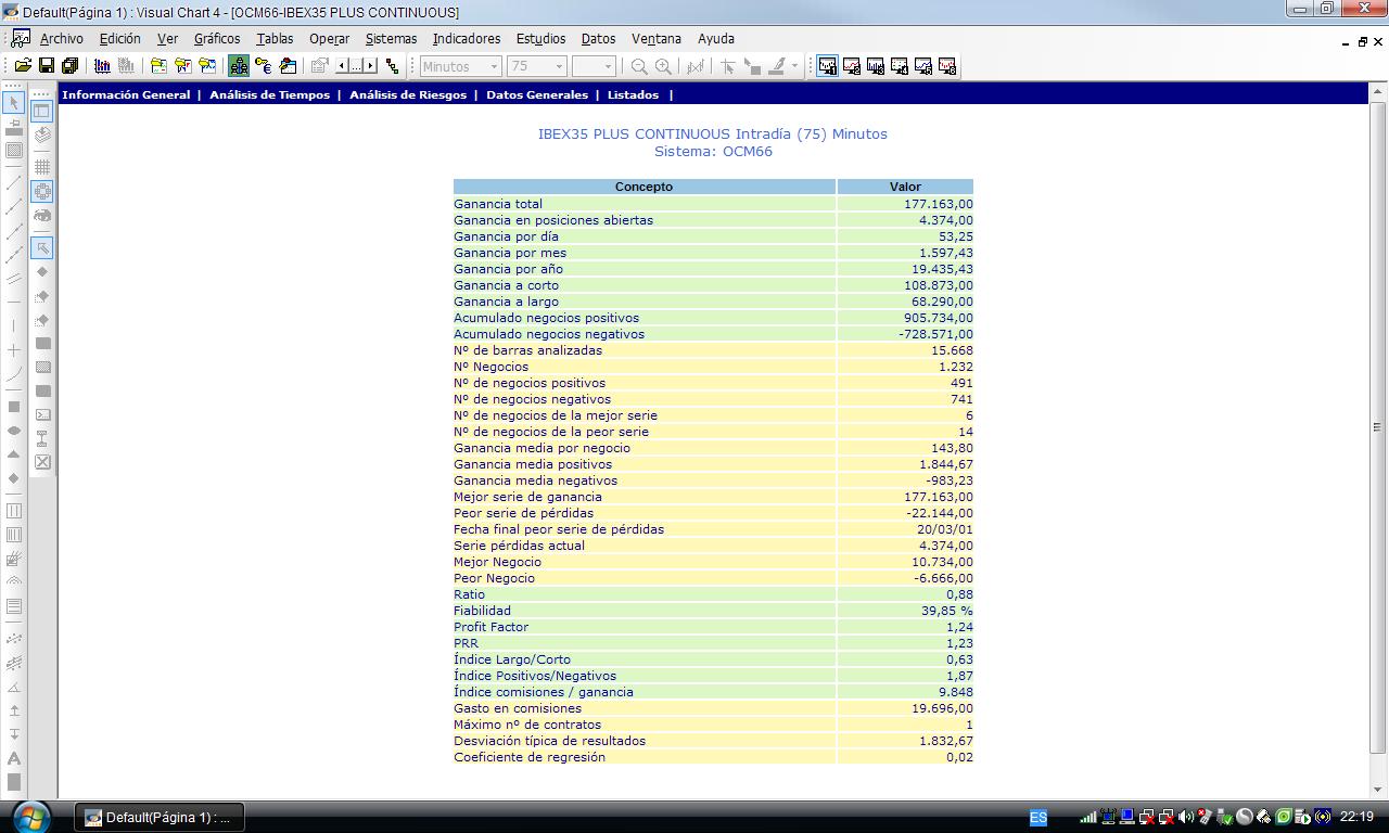 El tema es que quien quiera, le heche un vistazo a las estadísticas, y exponga cuál es el problema del sistema, o cuál cree que puede ser su punto débil, y en qué debería mejorar. También se debe aportar una posible solución. Si os apetece participar y la gente expone sus puntos de vista, luego voy a colgar el sistema (es en visual chart, y en plataforma visual), y que cada uno lo mejore, lo cuelgue de nuevo con sus mejoras y cuelgue sus estadísticas.