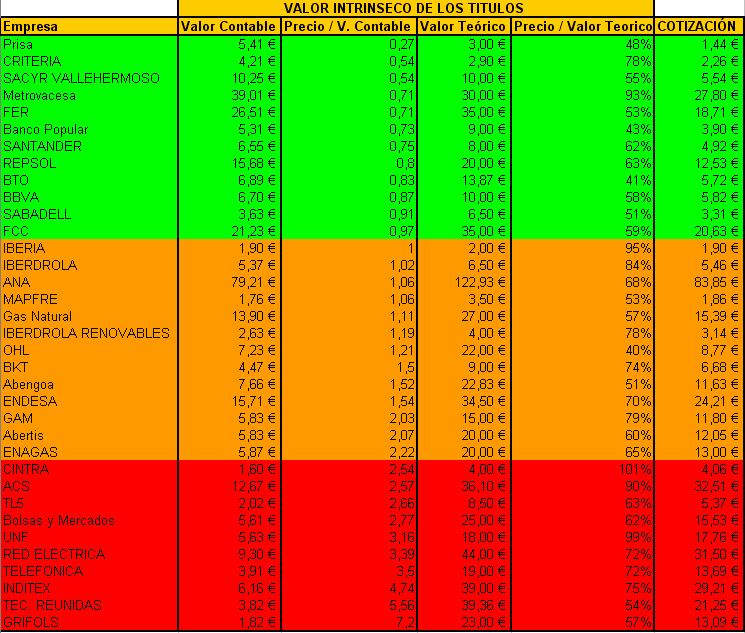 Actualmente, gracias al pesimismo económico infundado por los medios de comunicación y la crisis actual, hay empresas que si las vendieran sacarían más que su cotización actual, tal y como se puede ver en el grafico adjunto a este post.