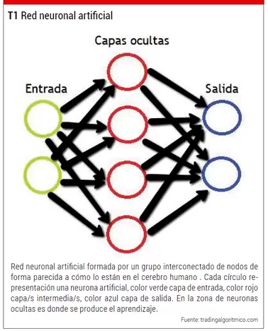En una red de neuronas artificiales (RNA), recibiremos los datos de entrada a través de una capa (nodos de entrada), serán procesados en otra capa/s (nodos ocultos) y los datos finales del pensamiento será a través de la capa de salida (nodos de salida). Los nodos ocultos son fundamentales pues es donde se realiza el proceso de aprendizaje tomando la decisión más adecuada u óptima. Cada neurona está conectada con otra a través de un enlace. El valor de salida de una neurona es multiplicada por un peso al llegar a la siguiente. El estado de ese peso pueda inhibir o activar a las siguientes neuronas (sopesa la decisión). Existe una función de activación que impone un límite que debe ser sobrepasado antes de llegar a las siguiente neuronas. Por eso estos sistemas se pueden entrenar, en esa fase aprenden por sí mismos en vez de ser algoritmos con reglas programadas que se ejecutan sin fase de pensamiento. El objetivo es que resuelvan problemas, tomen decisiones acertadas sin la intervención humana.